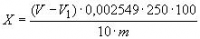 где V - объем раствора гидроокиси натрия концентрации точно 0,1 моль/дм3, израсходованный на титрование анализируемого раствора, см3;