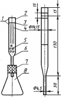 Устройство состоит из конической колбы вместимостью 250 см3, в которую на резиновой пробке вставлена стеклянная трубка. В нижнюю часть трубки помещают тампон из ваты, предварительно пропитанной раствором уксуснокислого свинца, выше тампона вертикально помещают полоски бумаги, пропитанной раствором уксуснокислого свинца. На верхний срез трубки помещают квадрат бромнортутной бумаги и прижимают его отрезанной частью трубки с помощью резинок, надеваемых на стеклянные крючки. Края трубок 2 и 6 должны быть отшлифованы.