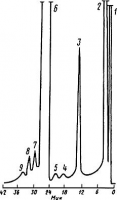 1 - трифторуксусный ангидрид; 2 - хлороформ; 3 - 1,2-дихлорбензол; 4 - неидентифицированная примесь; 5 - N-трифторацетанилид; 6 - 2-толуил-N-трифторацетамид; 7 - 2-нитротолуол; 8 - 3-толуил-N-трифторацетамид; 9 - 4-толуил-N-трифторацетамид