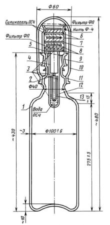 Затем ампулы охлаждают в эксикаторе (черт.13) до температуры окружающей среды. В наружную кольцевую емкость эксикатора засыпают хлористый кальций или силикагель, поверхность которого покрывают фильтром ФПП-Д для предотвращения попадания в ампулу влаги и пыли. Ампулу охлаждают в эксикаторе до постоянной массы.
