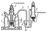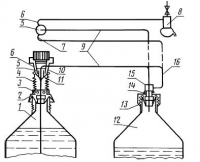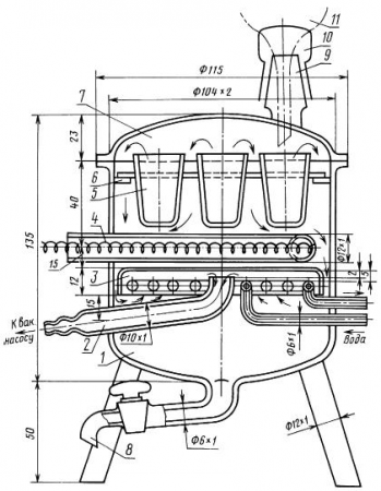 В колоколе имеются две несмыкающиеся по окружности вмятины 8, на которых с помощью рожек 4 закрепляют в вертикальном положении ампулу 3 и колокол с ампулой устанавливают в корпусе на пришлифованном фланце. Создают в системе водоструйным насосом 7 (черт.11) необходимое разряжение (около 100 мм рт.ст.), регулируемое воздушным краном 6 по манометру 8.
