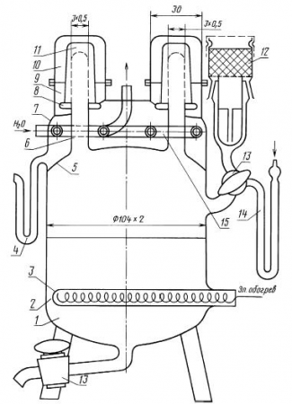 1 - корпус испарительной части аппарата; 2 - колокол; 3 - ампула; 4 - рожки; 5, 6 - фланцы;