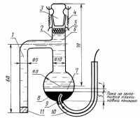 При заливе ампулы азотной кислотой из бюретки, в последнюю через наружный канал пробки крана засасывают атмосферный воздух, предварительно очищенный силикагелем от химических загрязнений, пропущенный через фильтр ФПП-Д для удаления аэрозолей и промытый водой. На ампулу с навеской надевают колокол 2 с термокарманом 7 (черт.12).