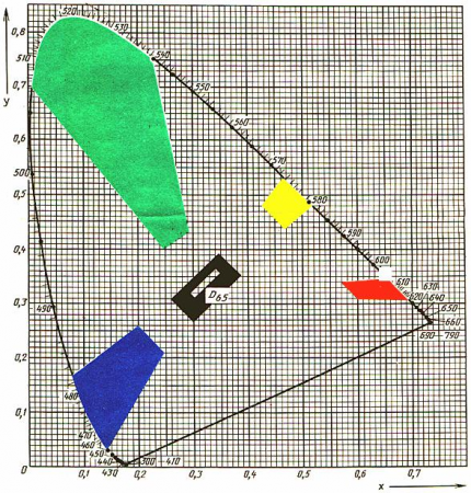 на цветовом графике МКО и предельные значения коэффициента яркости