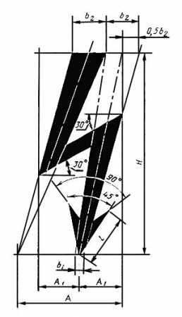 2.12. Предупреждающую окраску объектов и элементов, указанных в п. 2.11 б, г следует выполнять в виде чередующихся наклонных под углом 45-60° полос шириной от 30 до 200 мм желтого сигнального и черного цветов при соотношении ширины полос 1:1. Ширину полос следует устанавливать в зависимости от размера объекта и расстояния, с которого должно быть видно предупреждение.