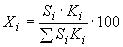 Объемную долю каждого компонента (Xi) в процентах вычисляют по формуле