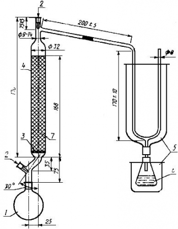 1 - реакционная колба со шлифом вместимостью 500 см3; 2 - термометры; 3 - стеклянная решетка; 4 - колонка, наполненная стеклянной насадкой; 5 - охлаждающая баня со льдом; 6 - приемник; 7 - кольца Рашига стеклянные 5х5х0,5