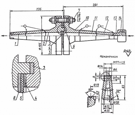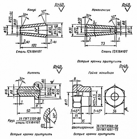 1 - наконечник из стали марки 12Х18Н10Т (ГОСТ 5632-72); 2 - фланец (I) 50-100 (ГОСТ-12821-80) из стали марки 12Х18Н10Т (ГОСТ 5632-72); 3 - кольцо из листовой меди (ГОСТ 495-92) диаметром 88/73, толщиной 2 мм; 4 - прокладка из резины диаметром 72/45, толщиной 3 мм; 5 - фильтр типа АФА; 6 - сетка опорная металлическая 0,5Х0,5 мм из стали 1Х18Н9Т; 7 - шайба 24 по ГОСТ 11371-78; 8 - гайка М 24-25 по ГОСТ 9064-75; 9 - шпилька М24Х115-36 по ГОСТ 9066-75; 10 - фланец (II) 50-100 по ГОСТ 12821-80 из стали марки 12Х18Н10Т (ГОСТ 5632-72); 11 - конус из стали марки 12Х18Н10Т (ГОСТ 5632-72); 12 - наконечник из стали марки 12Х18Н10Т (ГОСТ 5632-72); 13 - ниппель из круга 25 (ГОСТ 2590-88) из стали марки 12Х18Н10Т (ГОСТ 5632-72); 14 - гайка накидная из шестигранника 36 (ГОСТ 8560-78); из шестигранника 20 (ГОСТ 1051-73)