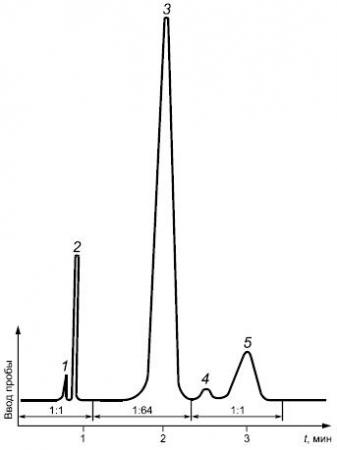 1 и 4 - неидентифицированные компоненты; 2 - Вода; 3 - фурфурол; 5 - метилфурфурол