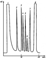 1 - Бензол; 2 - 1,4-дихлорбензол; 3 - 1,2,4-трихлорбензол; 4 - 1,2,3-трихлорбензол; 5 - 1,2,4,5-тетрахлорбензол; 6 - 1,2,3,4-тетрахлорбензол; 7 - пентахлорбензол; 8 - гексахлорбензол