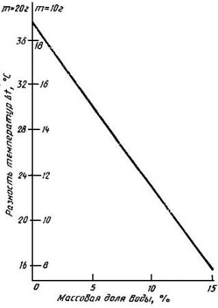 По графику, приведенному на черт.7, определяют содержимое воды в продукте (в процентах по массе) в соответствии с повышением температуры, наблюдаемым в процессе растворения.