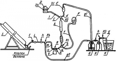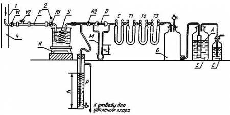 Поочередно открывают клапаны V1 и V2, поворачивают кран R1 так, чтобы отфильтрованный газообразный хлор поступал в направлении затвора P. Через 10 мин открывают проходной кран R2, чтобы поток хлора мог поступать в поглотительные трубки со скоростью 25 л/ч. Скорость потока хлора определяют по разности уровней тетрахлорметана, находящегося в двух отводах дифференциального манометра M, расходомера D, или по высоте шарика поплавкового расходомера. Поток хлора обеспечивают регулированием зазора (ширины проходного отверстия) клапанов и высоты h тетрахлорметана в затворе P.