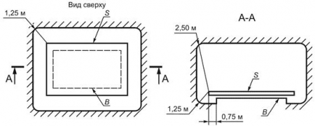 - граница зоны досягаемости токоведущих частей рукой человека, находящегося на поверхности S ; 0,75; 1,25; 2,50 м - расстояния от края поверхности S до границы зоны досягаемости