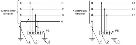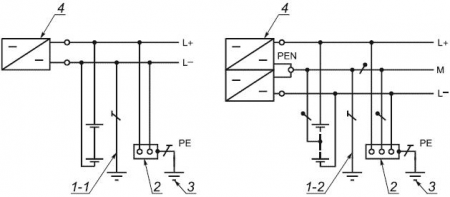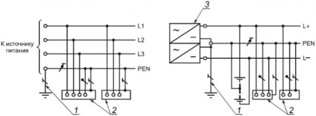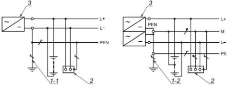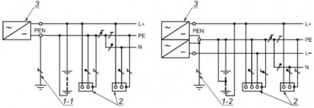 1 - заземлитель нейтрали источника переменного тока; 1-1 - заземлитель вывода источника постоянного тока; 1-2 - заземлитель средней точки источника постоянного тока; 2 - открытые проводящие части; 3 - источник питания
