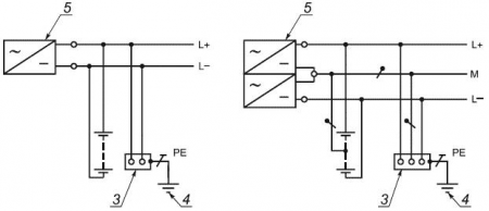 1 - заземлитель нейтрали (средней точки) источника питания; 2 - открытые проводящие части; 3 - источник питания постоянного тока