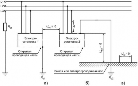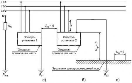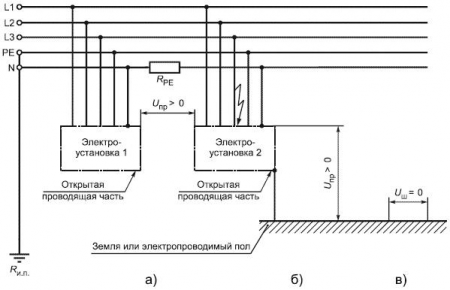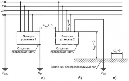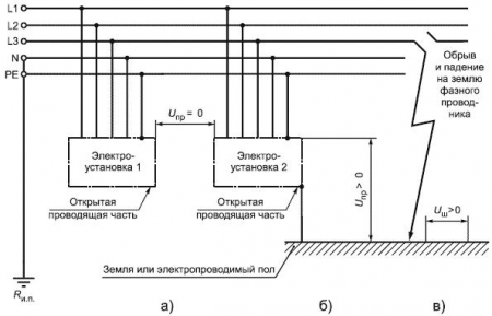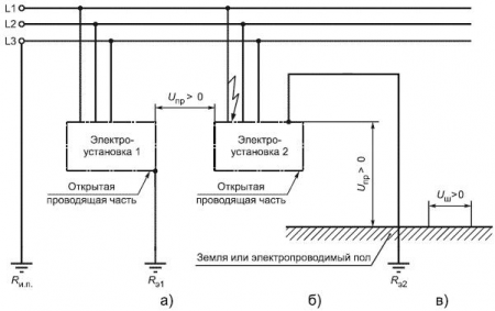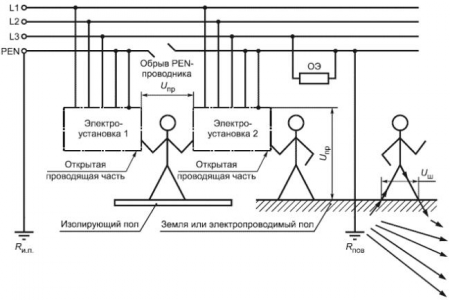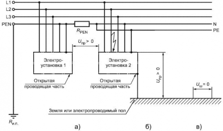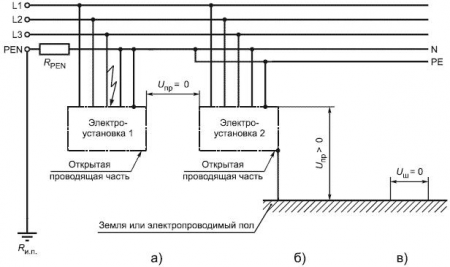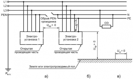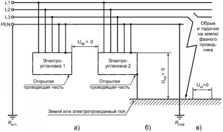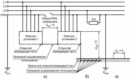 Uпр - напряжение прикосновения, на участке а) оно равно нулю, на участке б) - близко к нулю; Uш - шаговое напряжение, на участке б) оно близко к нулю, на участке в), где отсутствует выравнивание потенциалов, оно может достигать опасных для жизни людей и животных значений; Rи.п. - заземлитель источника питания; Rпов - заземлитель для повторного заземления PEN-проводника; ОЭ - однофазный электроприемник
