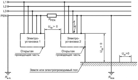 Uпр - напряжение прикосновения; Uш - шаговое напряжение; Rи.п - заземлитель источника питания; Rпов - заземлитель для повторного заземления PEN-проводника; RPEN - полное сопротивление PEN-проводника