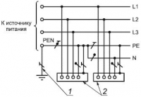 3.29 повторное заземление: Заземление совмещенных нулевого защитного и нулевого рабочего проводников (PEN-проводника) на концах воздушных линий электропередачи или ответвлений от них длиной более 200 м, а также на вводах воздушных линий электропередачи к электроустановкам, в которых в качестве защитной меры при косвенном прикосновении применено автоматическое отключение питания.