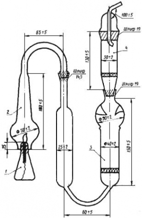 В поглотитель вносят 10 см3 раствора щелочи, закрывают его брызгоулавливателем, в который предварительно наливают 1-2 см3 дистиллированной воды. Брызгоулавливатель закрывают пришлифованной пробкой со вставленной стеклянной трубкой, соединяющейся с вакуумным насосом. Включают вакуумный насос и регулируют скорость подачи воздуха таким образом, чтобы через раствор щелочи проходили частые пузырьки, но не было сильного разбрызгивания раствора.