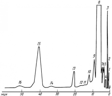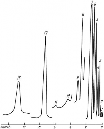 1, 5, 6, 8, 9, 10 - неидентифицированные примеси; 2 - диэтиловый эфир; 3 - Этанол; 4 - Этилацетат; 7 - этилцеллозольв; 11 - этиленгликоль; 12 - октанол-1; 13 - этилкарбитол