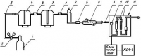 1 - баллон с азотом; 2 - редуктор; 3 - резиновый шланг; 4 - склянка Тищенко (с ангидроном); 5 - склянка Тищенко (с P2O5); 6 - фторопластовая трубка; 7 - печь для сублимации йода; 8 - холодильник; 9 - стеклянный фильтр; 10 - чувствительные элементы; 11 - ротаметр