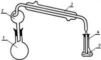 Прибор для отделения аммиака дистилляцией (черт.3), состоящий из следующих частей: круглодонной длинногорлой колбы 1 вместимостью 250 см3, лабораторного стеклянного холодильника 3 с длиной кожуха 250-400 мм; брызгоуловителя 2, диаметром 50-60 мм; мерного цилиндра 5 вместимостью 50 см3 для приема дистиллята; стеклянной отводной трубки 4 для наращивания нижнего конца холодильника.