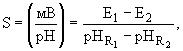 Рассмотрим гальванический элемент: электрод сравнения - насыщенный раствор KCl - раствор PlPt*H2. Для буферных растворов R1 и R2 с известными значениями pH - соответственно pHR1 и pHR2 измеренные значения разности потенциалов составляют соответственно E1 и E2.