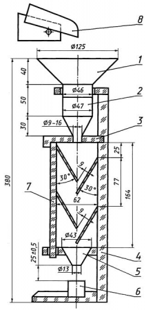 1 - большая приемная воронка; 2 - малая воронка; 3 - объемная крышка; 4 - корпус; 5 - направляющая воронка; 6 - стакан емкостью 25 см3; 7 - система четырех пластинок; 8 - лотковый вибропитатель