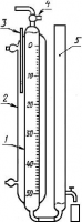 1 - измерительная бюретка; 2 - водяная рубашка; 3 - термометр; 4 - трехходовой кран;