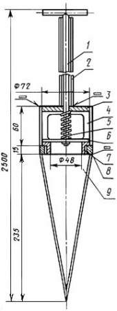 2 - направляющая трубка, в которой перемещается шток 1; 3, 7 - верхний и нижний резьбовые фланцы; 4 - цилиндрический корпус с окнами; 5 - пружина; 6 - шайба для перекрывания отверстия; 8 - резьбовая шайба; 9 - полый конус