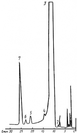 альдегид; 5 - Ацетон; 6 - Этиловый спирт; 7 - Бензол (стандарт)