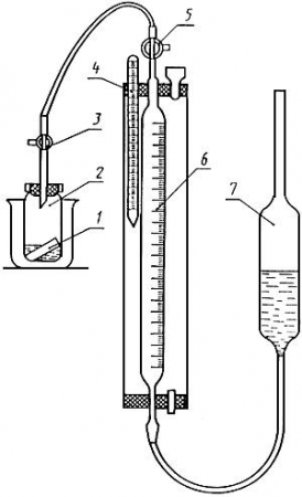 1 - стеклянная пробирка по ГОСТ 25336; 2 - сосуд типа СЦ-0,5 по ГОСТ 25336; 3, 5 - краны соединительные по ГОСТ 7995; 4 - термометр по ГОСТ 28498; 6 - бюретка типа 3-2-100-0,2 по ГОСТ 29252; 7 - уравнительная склянка по ГОСТ 25336