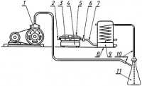 3.6. Массовую долю ртути определяют по разнице 100% и содержания нелетучего остатка. Схема установки для возгонки ртути приведена на чертеже. Установка для возгонки ртути состоит из форвакуумного насоса 1, обеспечивающего скорость эвакуации газов из зоны пиролиза 6-10 дм3/мин, входного отверстия 2, тигля 3 с анализируемой ртутью, электронагревателя 4, снабженного терморегулятором, позволяющим фиксировать температуру нагрева 300-600 °С, герметической стальной камеры 5 из нержавеющей стали, толщиной стенок не менее 4 мм (в крышку камеры встроен автономный нагревательный элемент, позволяющий поддерживать температуру крышки 80-100 °С), выходного отверстия из камеры 6, стального газохода 7, конденсатора 8, приемной камеры 9, резинового газохода 10, колбы Бунзена 11 вместимостью 3-5 дм, заполненной раствором Полежаева (2,5 г йода по ГОСТ 4159 и 30 г йодида калия по ГОСТ 4232 растворяют в 1 дм дистиллированной воды).