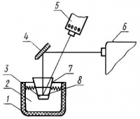 Приставка для измерения интенсивности люминесценции при температуре жидкого азота (черт.2). При проведении анализа тигель 7 с анализируемым раствором 3 помещают в пенопластовую чашку 1, заполненную жидким азотом 2. После того, как раствор в тигле замерзнет, в тигель заливают жидкий азот 8. Люминесценцию возбуждают сверху осветителем 5и направляют зеркалом 4 на входную щель прибора 6.