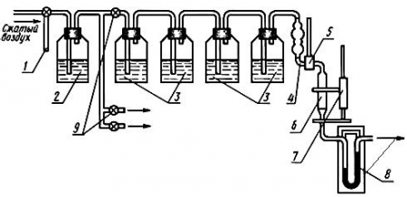а) при пуске установки сначала закрывают пробкой склянку 2, включают воздуходувку при положении трехходового крана 1, соединяющего линию от воздуходувки с атмосферой, открывают краны 9 на осушительных склянках и только тогда при помощи крана 1 устанавливают необходимую скорость подачи воздуха в установку;