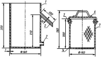 1 - металлический цилиндр; 2 - верхний сливной патрубок; 3 - нижний сливной патрубок; 4 - цилиндр-сетка; 5 - замок; 6 - перфорированная крышка; 7 - отверстия диаметром 12 мм и расстоянием между ними 17 мм
