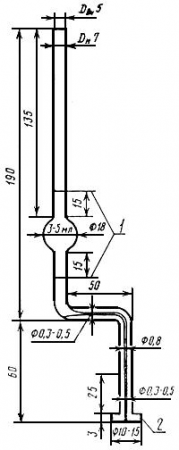 Сталагмометр для определения поверхностного натяжения водного раствора (черт.2), представляющий собой толстостенную трубку с расширением в середине. Ниже и выше расширения нанесены две метки. Объем между метками составляет 3-5 см3. Нижняя часть трубки сталагмометра согнута и в нее впаян капилляр, диаметром 0,3-0,5 мм. Площадка сталагмометра отшлифована.