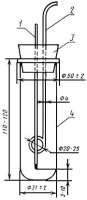 Устройство для определения температурных пределов посветления (черт.1) состоит из пробирки 4, изготовленной из термостойкого стекла, диаметром (31±2) мм и высотой 110-120 мм, которую закрывают пробкой 3 с тремя отверстиями; в центральное из них вставляют термометр 1 так, чтобы конец его находился на расстоянии 5-10 мм от дна пробирки, во второе вставляют кольцевую мешалку 2, а третье отверстие служит для сообщения с атмосферой.