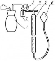 Поворотом трехходового крана на 90° прибор отключают от атмосферы, опускают уравнительную склянку до низа бюретки и выдерживают в этом положении 5 мин. Затем поднятием уравнительной склянки уравнивают водные мениски в бюретке и в склянке.
